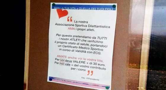 La vita vostra, dei vostri cari e dei vostri atleti vale molto più di 30 stupidi euro (questo il costo di un esame medico approfondito con ECG sotto sforzo se la vostra Associazione fa una convenzione con un serio Centro Medico Sportivo).