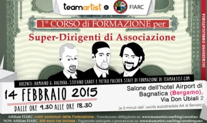 Gentile TeamArtist, è stato un piacere partecipare al Corso di Bagnatica. Io sono a un livello base di dirigente sportivo e l'ho trovato molto adatto alle mie necessità. Damiano è stato chiaro e per nulla noioso, tanto che sono riuscito a seguire bene tutte le 8 ore di corso senza “appisolarmi” (come avviene in altri convegni). Consigli: secondo me sarebbe interessante ritagliare un 15-30 minuti per ciascuna associazione per un incontro a 2 con un esperto di TeamArtist per eventuali domande personali dell'associazione. Inoltre secondo me per chi ha pagato 307 euro di corso, poteva starci che i 13 euro di pranzo fossero "offerti" dagli organizzatori. Chiaramente sono dettagli perché il corso è stato molto piacevole.