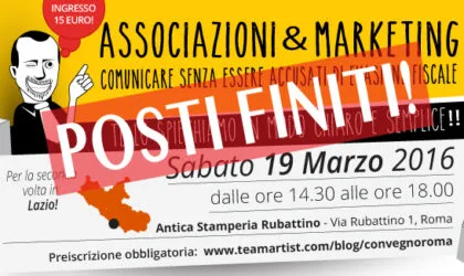 Sabato 19 Marzo 2016 a Roma dalle ore 14.30 alle 18.00, grazie all’Associazione Emotiva, in collaborazione con l’Associazione Cantieri Rubattino presso l’Antica Stamperia Rubattino, Via Rubattino 1 (Roma), faremo un Convegno aperto a tutti i dirigenti di Associazioni No profit (Asd, Aps, Onlus, Odv, Ong, Culturali, Ricreative, Musicali etc etc) dal titolo: