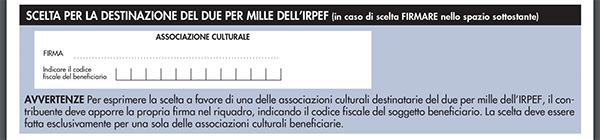 I contribuenti potranno quindi esprimere la scelta di destinare il 2 per mille dell’Irpef ad un’associazione culturale indicando il codice fiscale dell’associazione nell’apposita scheda del modello 730, CU o UNICO PF 2016