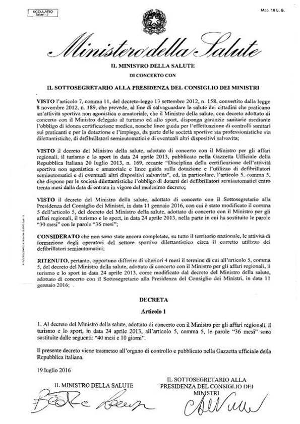 Roma, 20 luglio. Obbligo di Defibrillatori per l’associazionismo sportivo: prorogata a novembre l’entrata in vigore. Nella tarda serata di ieri un decreto del Ministero della salute permette all’associazionismo sportivo di avere più tempo per completare la formazione degli operatori, nella giusta prospettiva di salvaguardare la salute dei praticanti.